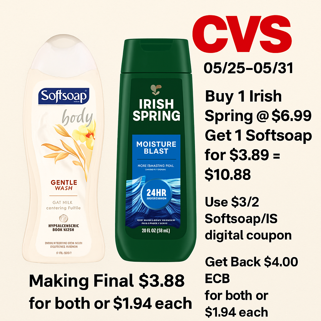 - Use $3/2 Irish Spring or Softsoap Digital Coupon