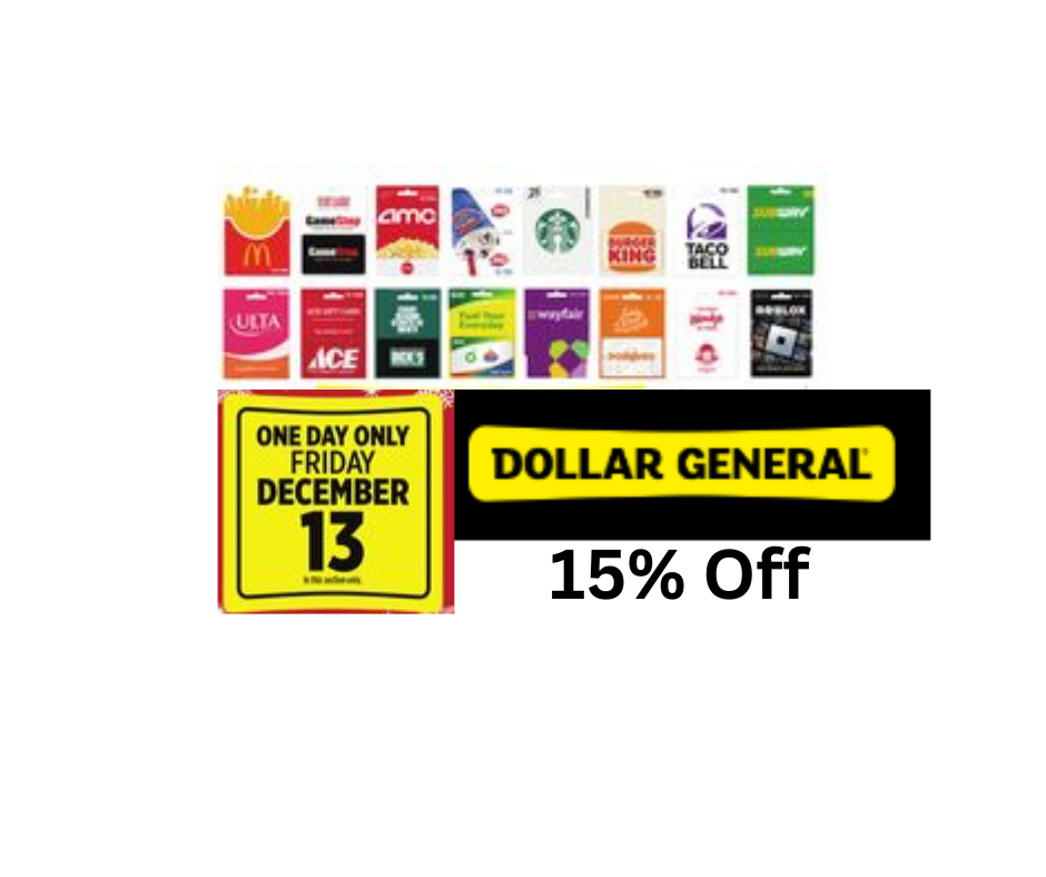 The holiday season is here, and Dollar General is giving you an amazing opportunity to save big! On Friday, December 13th, enjoy a 15% discount on a wide selection of gift cards during their one-day-only sale. Whether you’re shopping for loved ones or planning ahead for your favorite stores and restaurants, this is a deal you don’t want to miss!