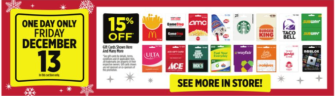1-DAY GIFT CARD SALE: 15% Off Select Gift Cards at Dollar General on December 13th!
