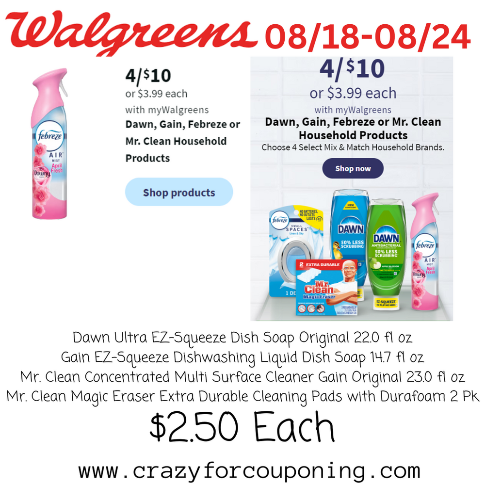 Are you looking to stock up on household products without breaking the bank? Look no further! This week at Walgreens, you can score an amazing deal on select Dawn, Febreze, Gain, or Mr. Clean products – 4 for $10.00 or 1 for $3.99. That's right, when you buy 4 items, each one comes out to just $2.50! Don't miss out on this incredible offer from August 18- August 24 and keep your home clean and fresh for less.