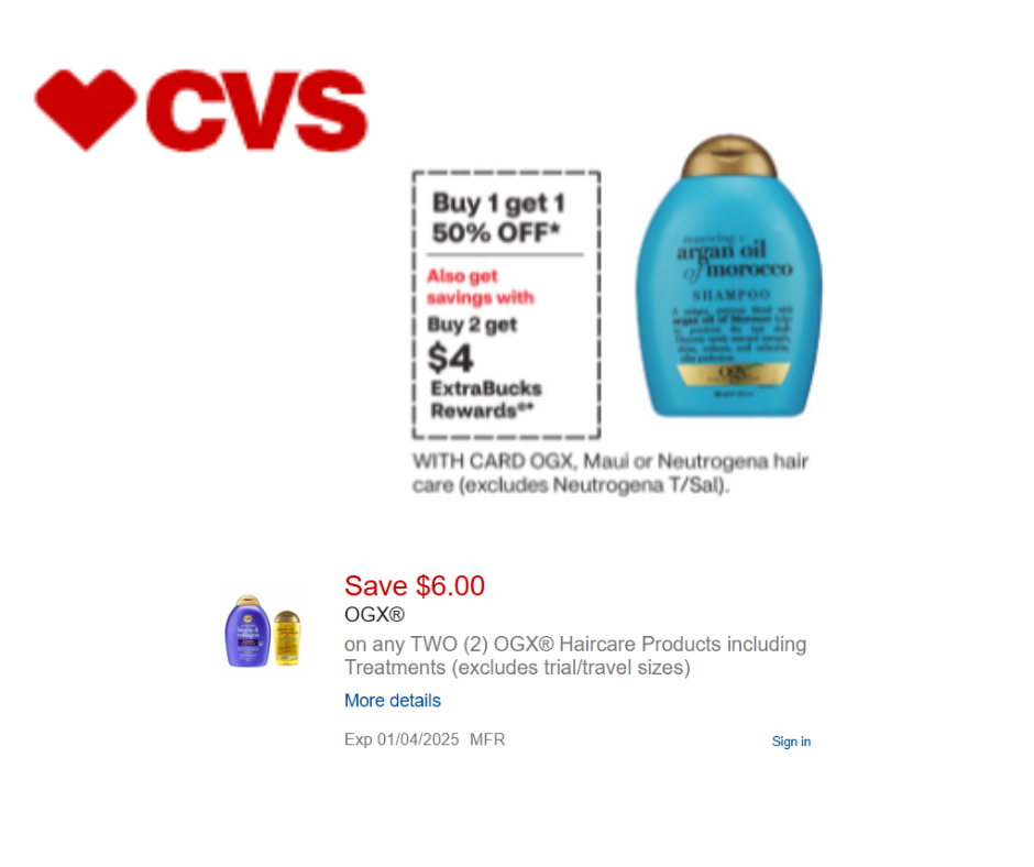 Looking to stock up on your favorite hair care products? CVS has an incredible deal running from 12/28 to 01/04 on OGX, Maui, and Neutrogena Hair Care. This is your chance to grab some high-quality hair products at unbeatable prices!