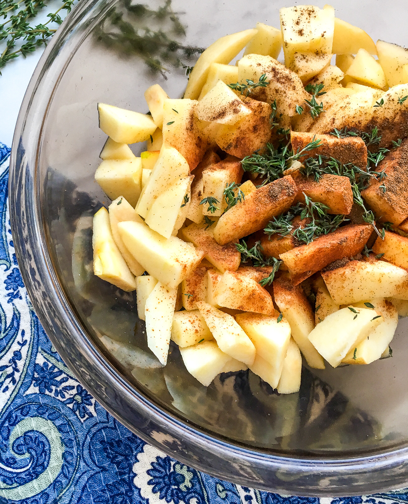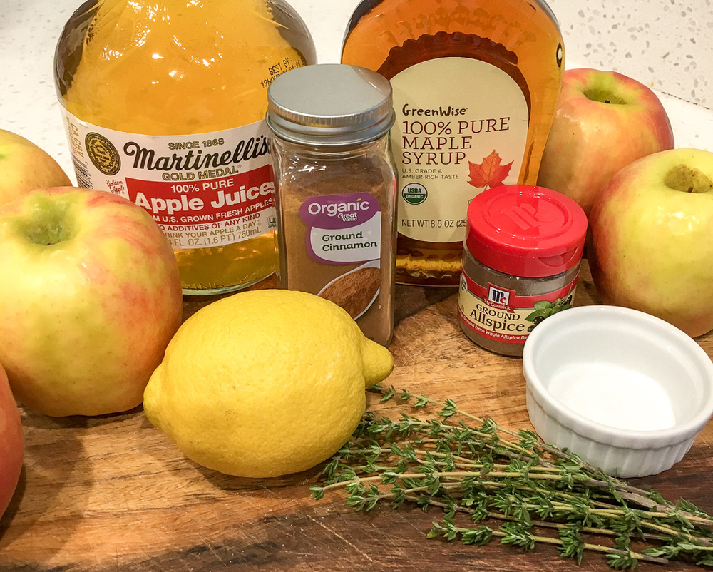 6 large apples, cored, peeled, and sliced 1 T. fresh lemon juice 1/3 c. real maple syrup 2 T. 100% apple juice (sugar free) 1 t. ground cinnamon ½ t. ground allspice 1½ t. fresh thyme leaves¼ t. salt