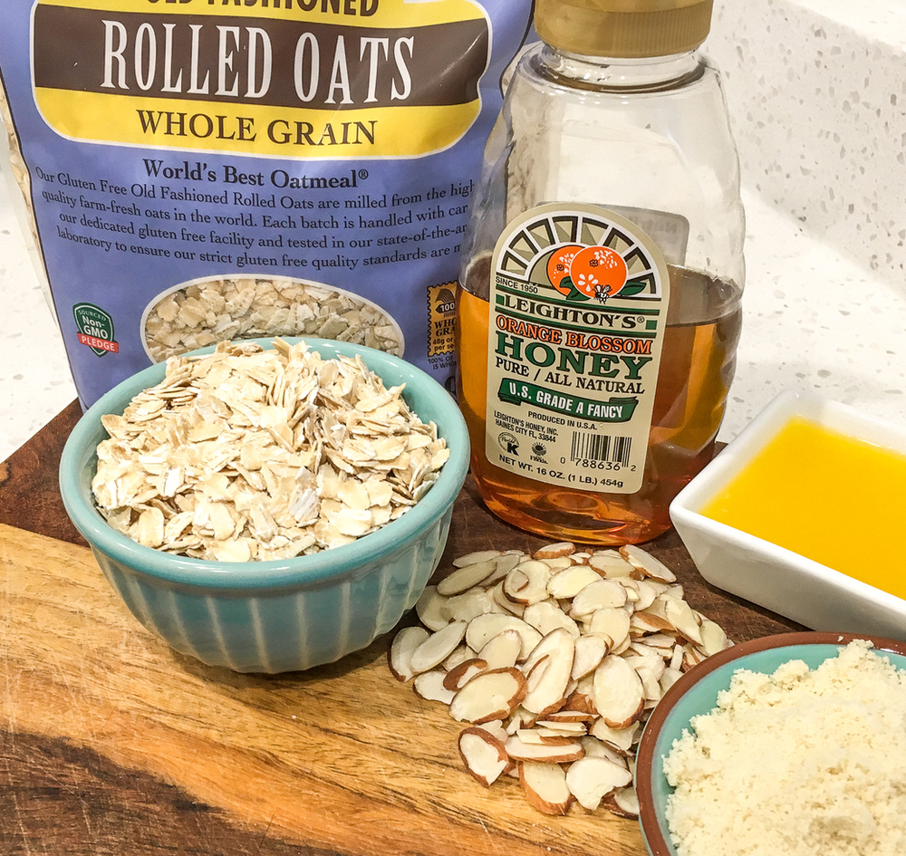 1 c. old-fashioned rolled oats 1/3 c. almond flour 1/3 c. almonds, sliced 1/3 c. honey, preferably local 3 T. unsalted butter, melted