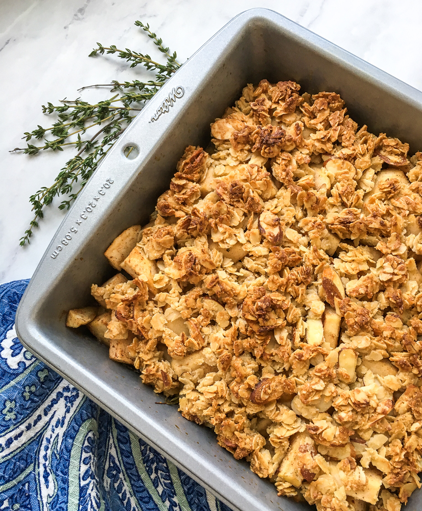 1. Place top oven rack in the center position and pre-heat oven to 350°F. Grease an 8” x 8” baking dish and set aside.2. Place apples in a large non-reactive bowl and toss with fresh lemon juice. Add maple syrup, apple juice, cinnamon, allspice, thyme leaves, and salt. Toss to combine and set aside. 3. Combine topping ingredients in a separate bowl and stir until oats are thoroughly coated and all ingredients are well combined. Set aside.