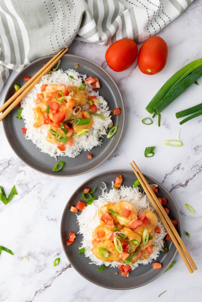 Start by heating oil in a skillet for frying. Coat seasoned shrimp in cornstarch for a crispy finish, then fry in batches for even cooking. While the shrimp cool, whip up the Bang Bang Sauce by whisking all the ingredients together until smooth. Toss the fried shrimp in the sauce, ensuring every piece is coated. Garnish with fresh tomatoes and green onions before serving.