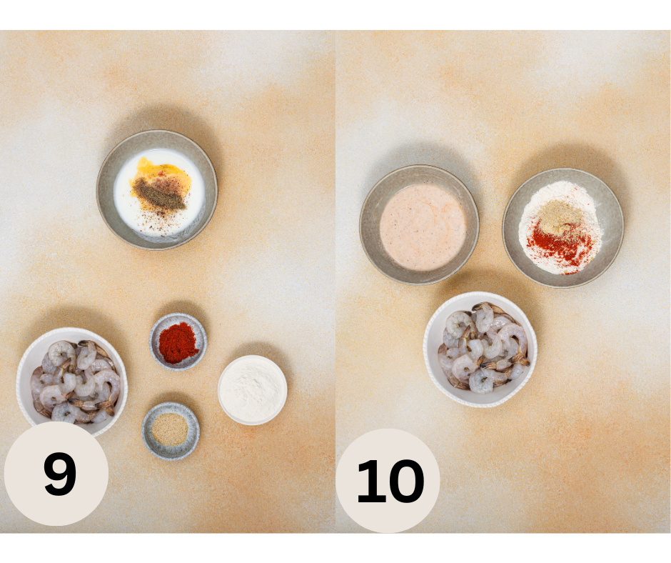9. Dip the shrimp first in the liquid mixture, then coat them in the flour mixture.
