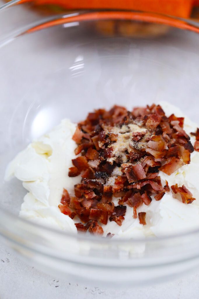 To make this Bunny Butt Cheeseball, start by combining softened cream cheese, bacon, garlic salt, Worcestershire sauce, and a cup of shredded cheddar cheese in a mixing bowl. Mix thoroughly until all ingredients are well incorporated, then chill for at least 30 minutes.