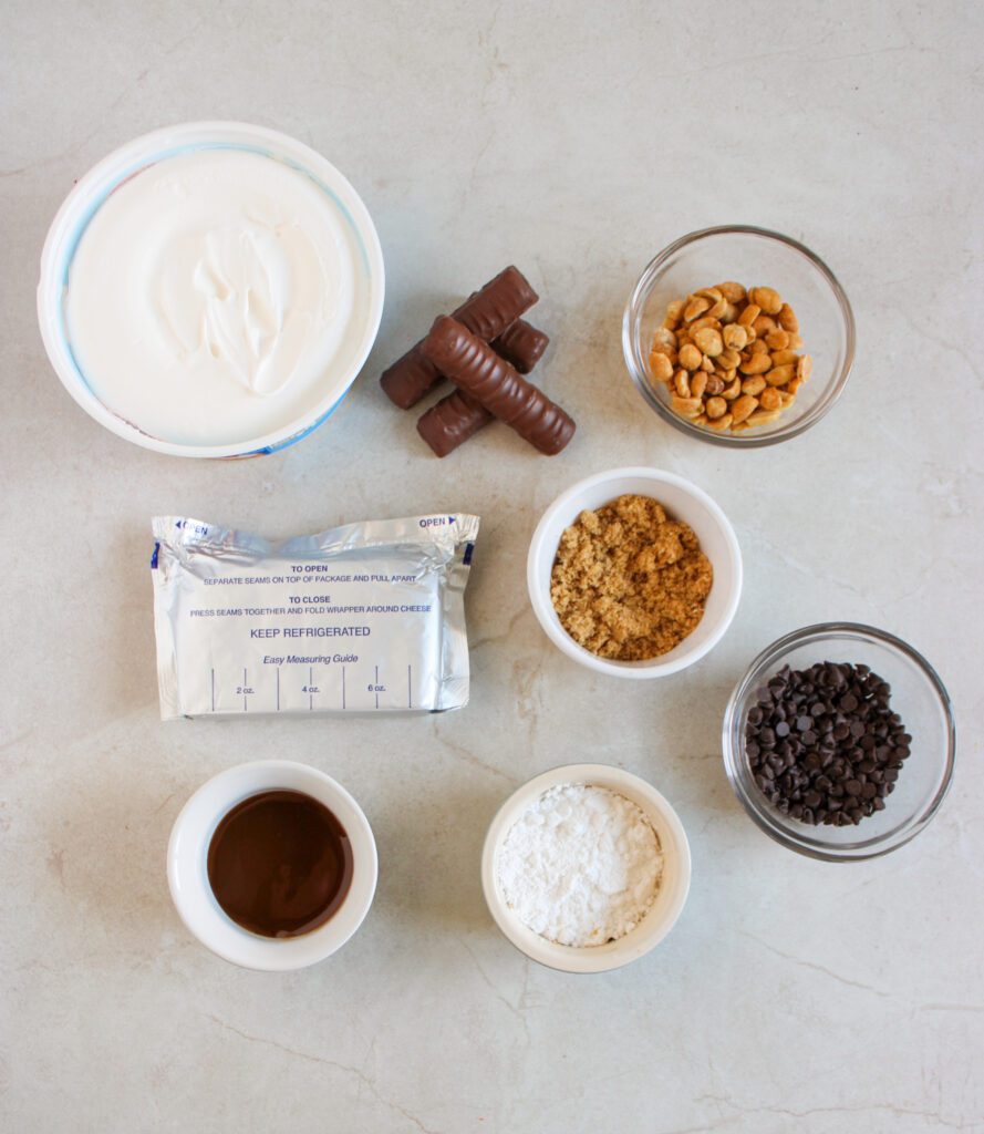 To create this indulgent dip, you’ll need cream cheese for a smooth and creamy base, cool whip to lighten the texture, and a combination of caramel sauce, brown sugar, and powdered sugar for that perfect balance of sweetness. The star ingredient, Twix bars, adds a delightful crunch with chocolate and cookie layers, while mini chocolate chips enhance the chocolatey goodness. Finally, peanuts add an extra crunch and a touch of saltiness to complement the sweet flavors.