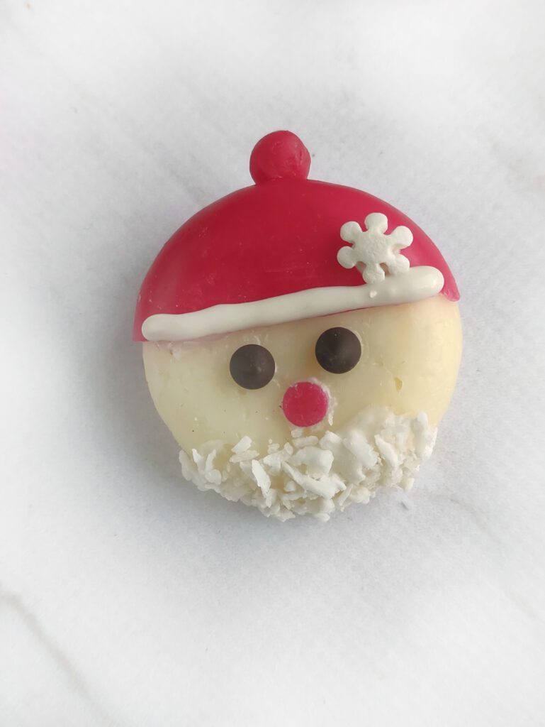 - For Santa, remove half of the wax. Warm some wax in your hands and roll it into a pom-pom. Press it against the hat, it will hold on. Dip the bottom of the cheese in white chocolate and sprinkle with coconut shavings. Attach the eyes and nose. decorate the hat with a strip of chocolate, snowflakes, coke shavings.