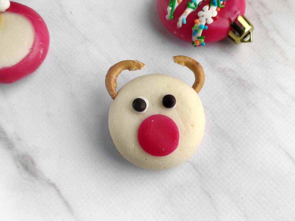 - Rudolph the Reindeer: To make Rudolph, remove the wax completely. Cut the nose out of the wax using the nozzle of the pastry syringe. Apply 3 drops of white chocolate and glue on the eyes and nose. Break the pretzels and insert the antlers into the reindeer.
