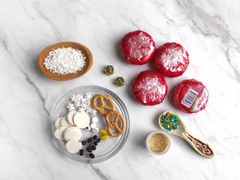 - Santa Babybels: For Santa, remove half of the wax. Warm some wax in your hands and roll it into a pom-pom. Press it against the hat, it will hold on. Dip the bottom of the cheese in white chocolate and sprinkle with coconut shavings. Attach the eyes and nose. decorate the hat with a strip of chocolate, snowflakes, coconut shavings.