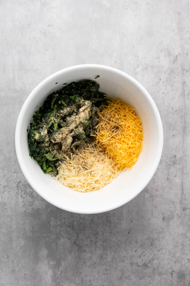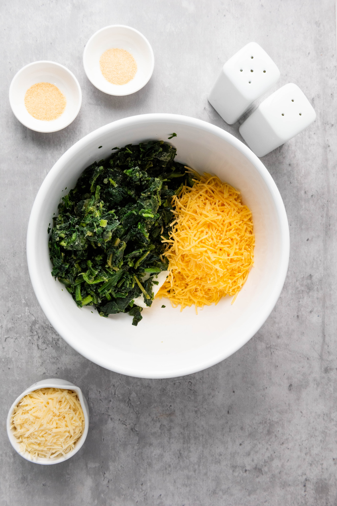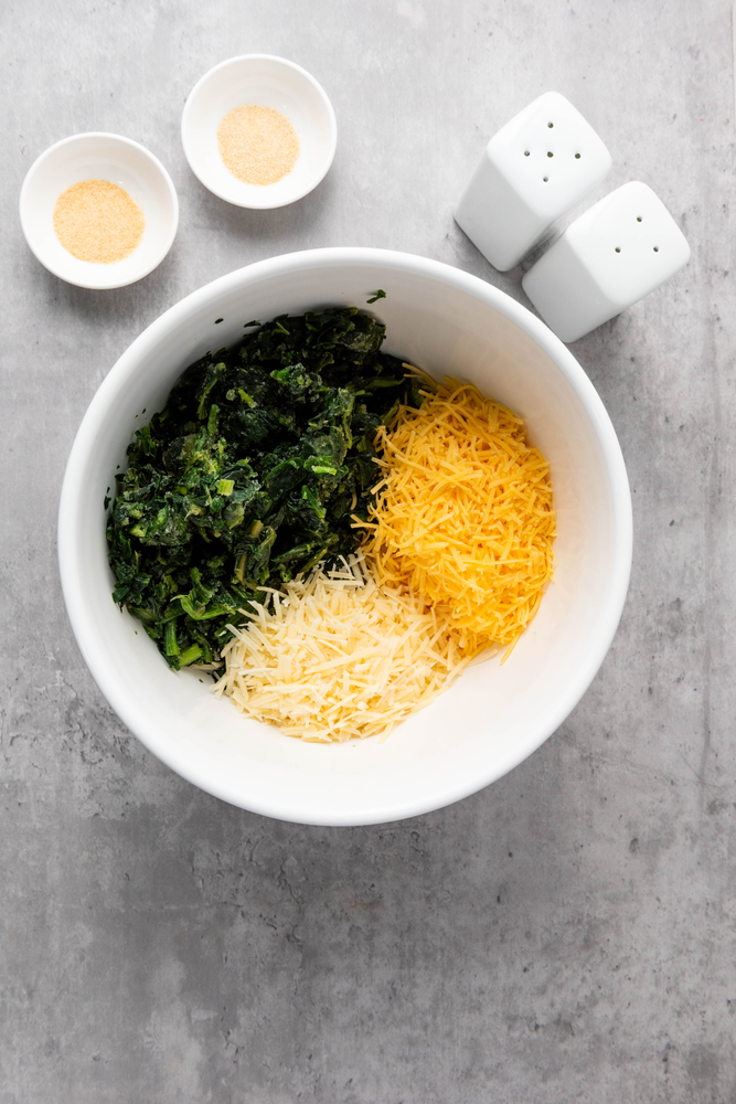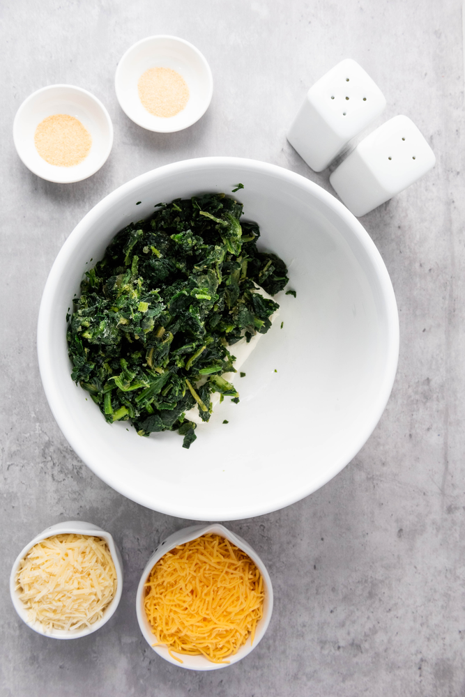 • In a medium mixing bowl, combine the spinach, cream cheese, mozzarella, Parmesan, garlic powder, onion powder, salt, and pepper. Mix until well blended.