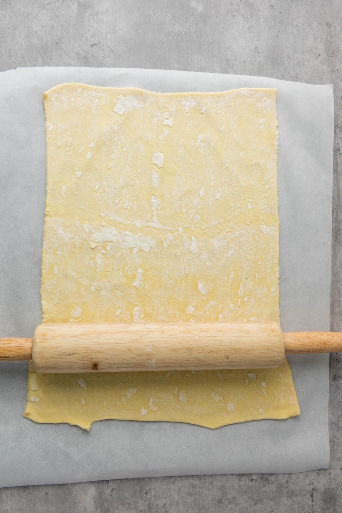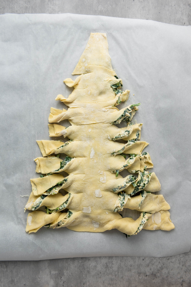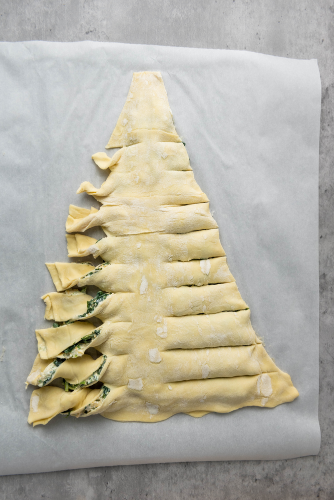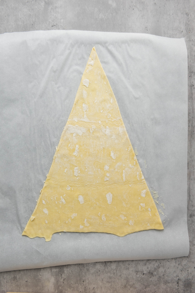 • Roll out one puff pastry sheet on a lightly floured surface. Shape it into a large triangle, which will form the base of the tree. Place it on the prepared baking sheet.