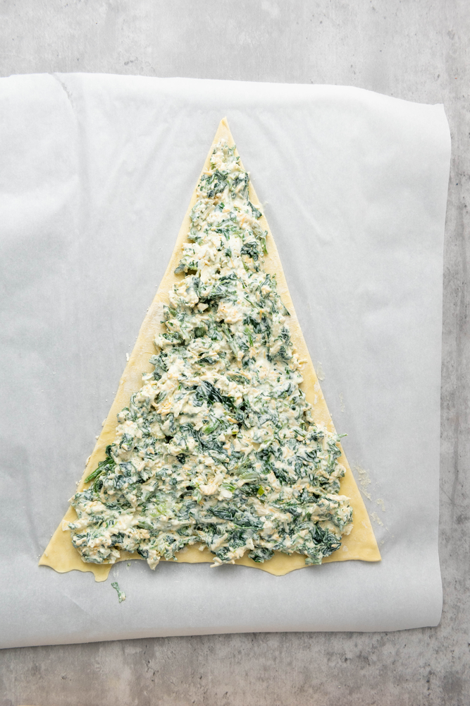 • Spread the spinach dip evenly over the puff pastry triangle.