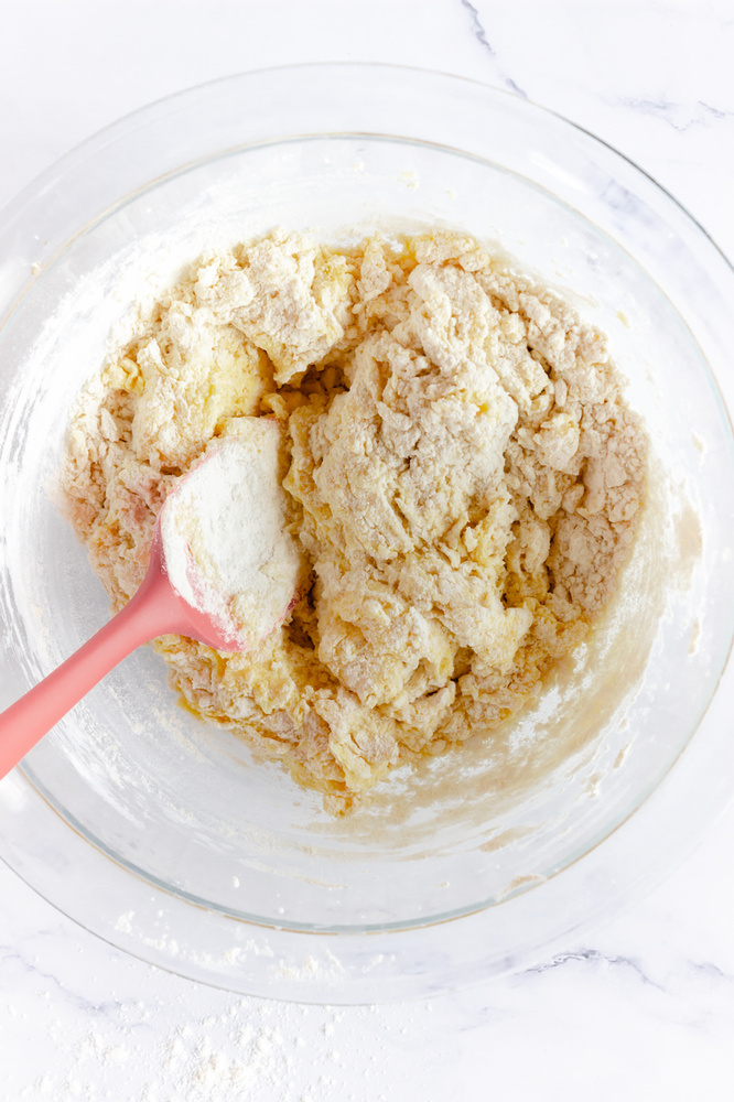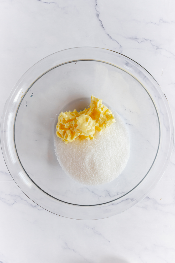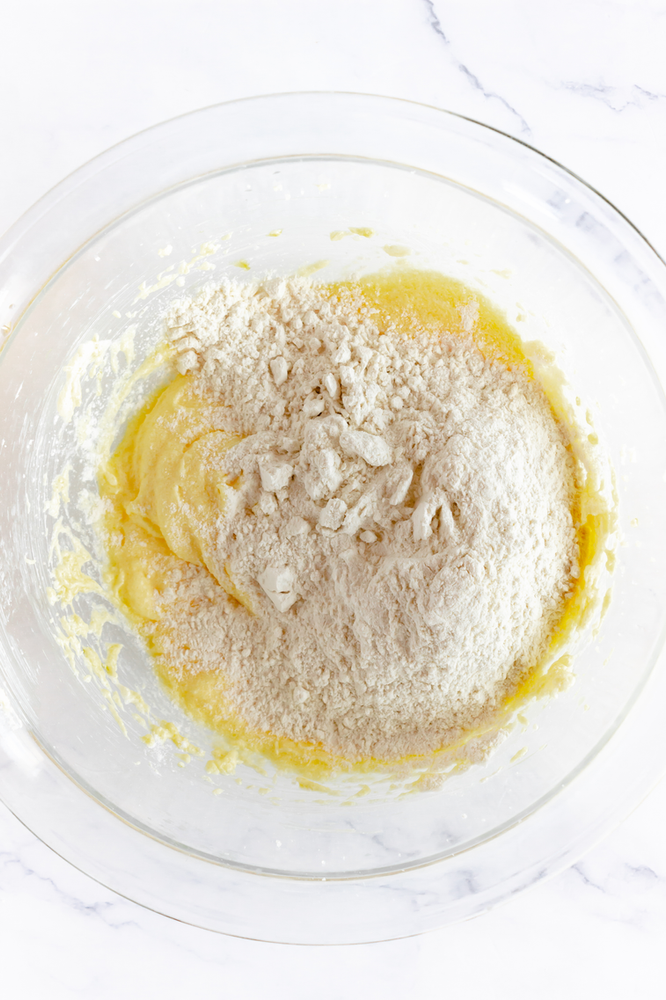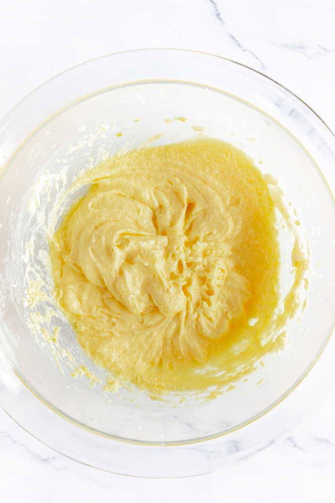Start by preheating the oven to 350 degrees. While the oven is preheating, make your cookie dough by creaming your butter and sugar together until light and fluffy. Once the butter and sugar are creamed, scrape the sides of your bowl, add the eggs and beat again until mixed.
