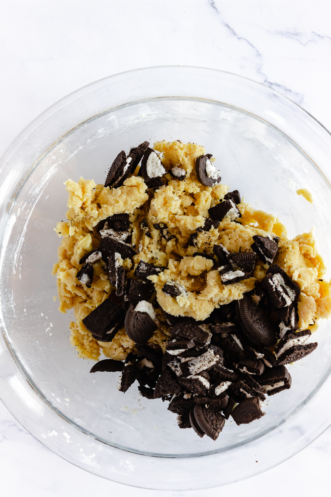 After scraping the sides of the bowl, mix in the flour and baking powder and mix well. Add the crushed Oreos and mix for about five seconds, but don't overmix the cookies. You don't want to smash them up.