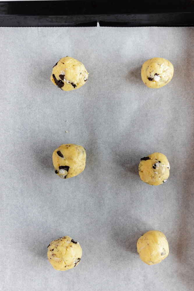 • Add chopped oreos and using a cookie scoop, form cookie balls.