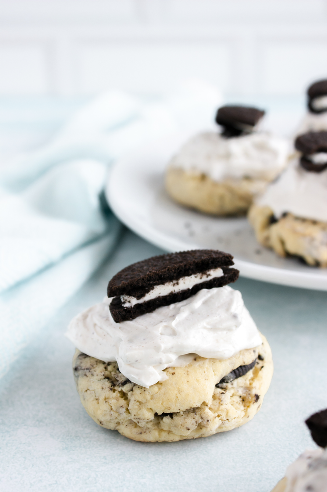 These are a sweet treat that you will never find at the grocery store. There are a lot of people who think the rich frosting on these cookies is a cream cheese frosting, you can choose to share the secret with them or you can let them know you have an official copycat Crumbl oreo cookies. These cream cookies is by far my favorite cookie at Crumbl. In store these are very HUGE cookies, but you can make smaller cookies.