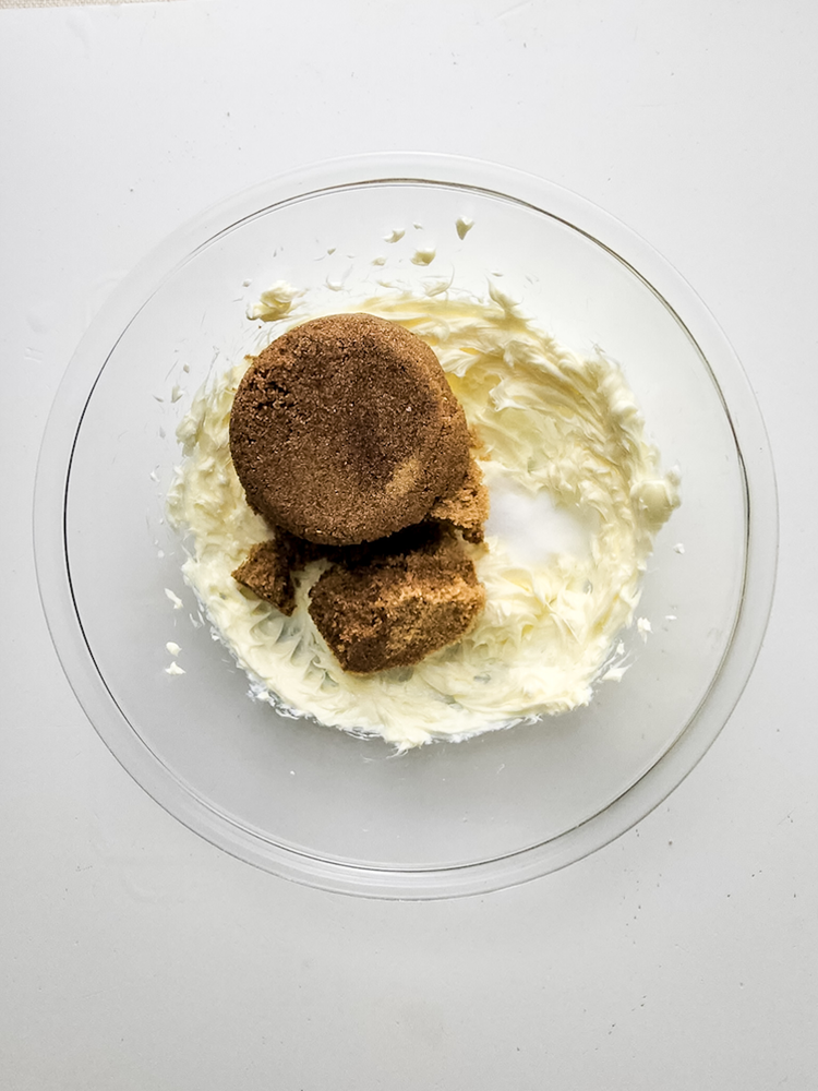 In a mixing bowl add the softened butter and brown sugar. Blend until creamy.
