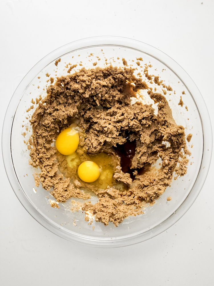 Then add in the eggs and vanilla together. Use a hand mixer to mix again until combined.