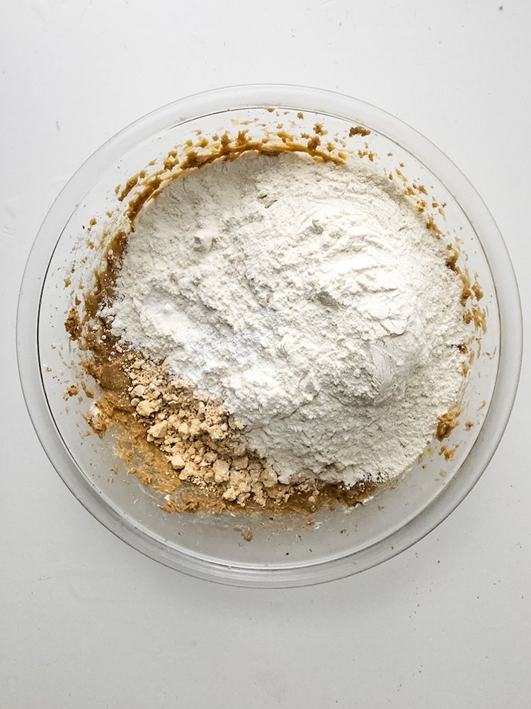 Pour the crushed graham crackers and flour into the wet ingredients along with the baking soda, powder and salt.