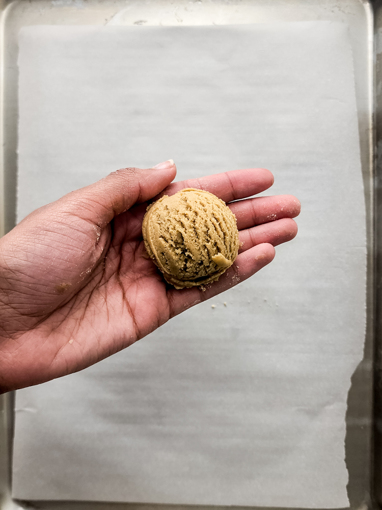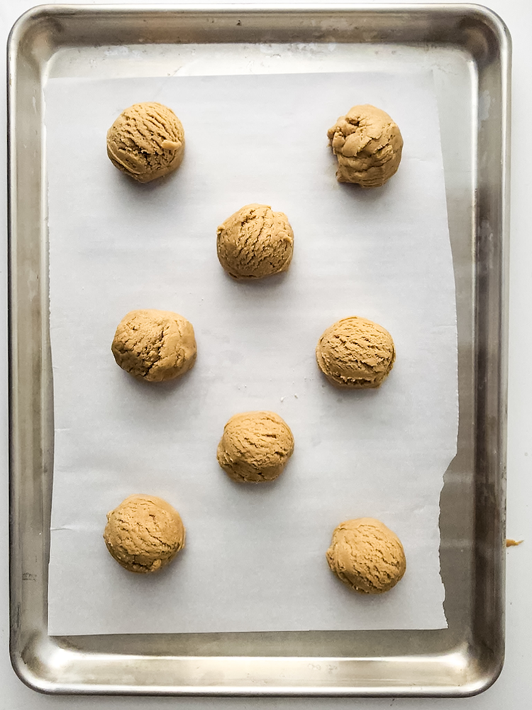 Use a large cookie scoop to make 2 inch round balls of cookie dough and place cookie balls on the prepared baking sheet about 2 inches apart from each other.