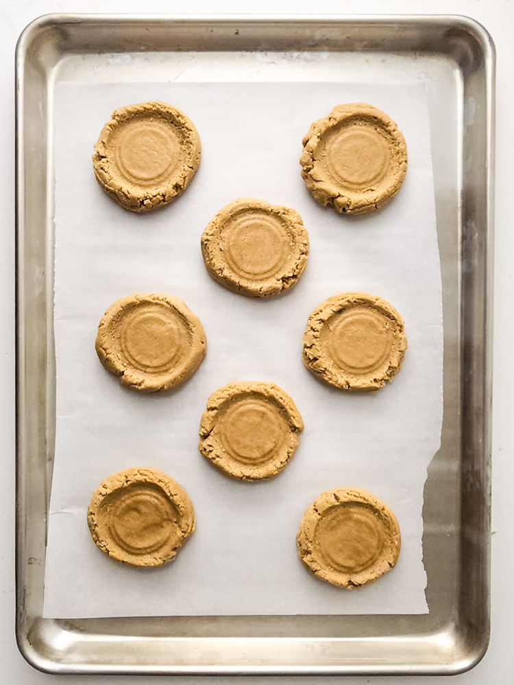 Use the bottom of a clean glass to press the center of each cookie and flatten, leaving a slight crinkly edge to each cookie, perfecting for filling with the key lime filling later.