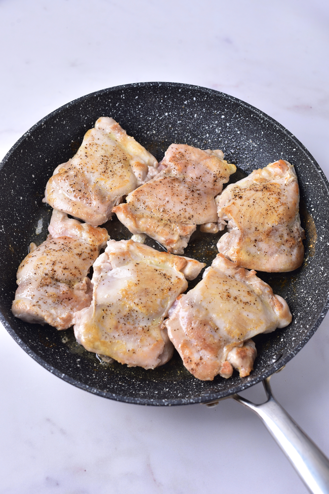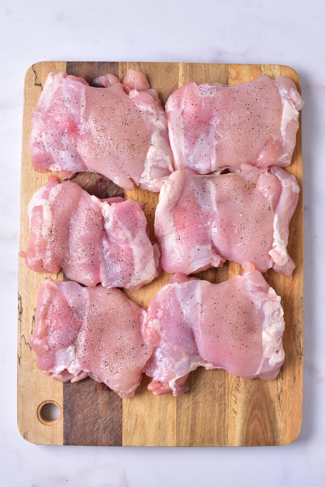 1. Salt and pepper the chicken thighs and slice chicken into pieces.