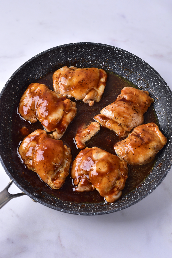 5. Transfer the chicken thighs to the pan and toss them until they are completely coated with the teriyaki. Heat for another 5 minutes, being careful not to thicken the sauce too much.