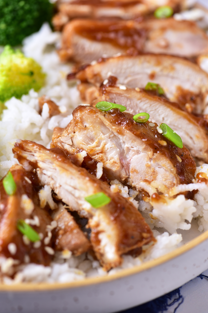 Serve teriyaki chicken with rice and broccoli. Before serving, you can sprinkle with sesame seeds and green onions.