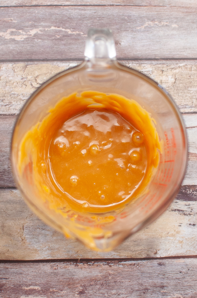 While the crust is cooling, let's make the caramel sauce! Melt the caramel pieces in the microwave in a microwave safe bowl. Combine caramel and heavy cream in a heatproof bowl, and heat in 30-second intervals until fully melted and smooth.