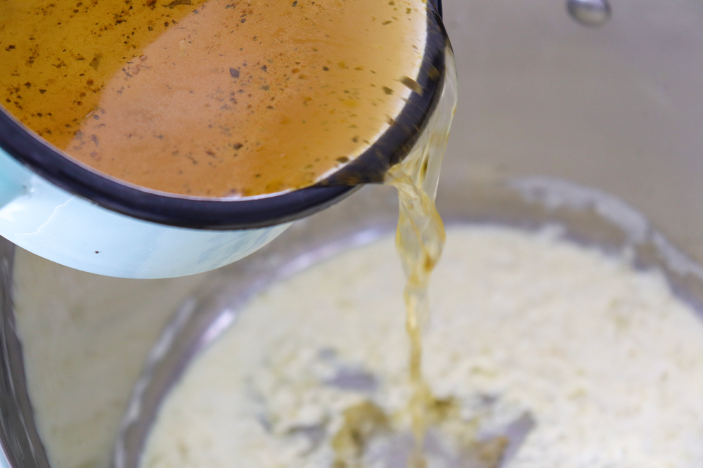 3. Add the vegetable or chicken broth and bring to a simmer.