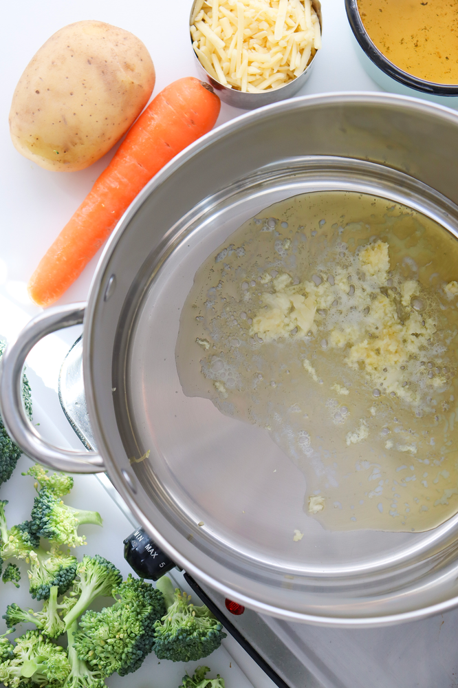 1. In a large pot, melt the butter over medium heat. Add the minced garlic and sauté for a few minutes until fragrant.