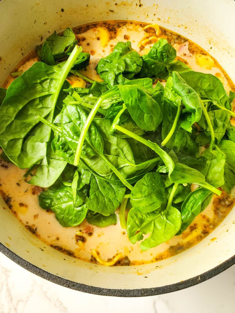 Stir in heavy cream and simmer another 10 minutes. - Add spinach: