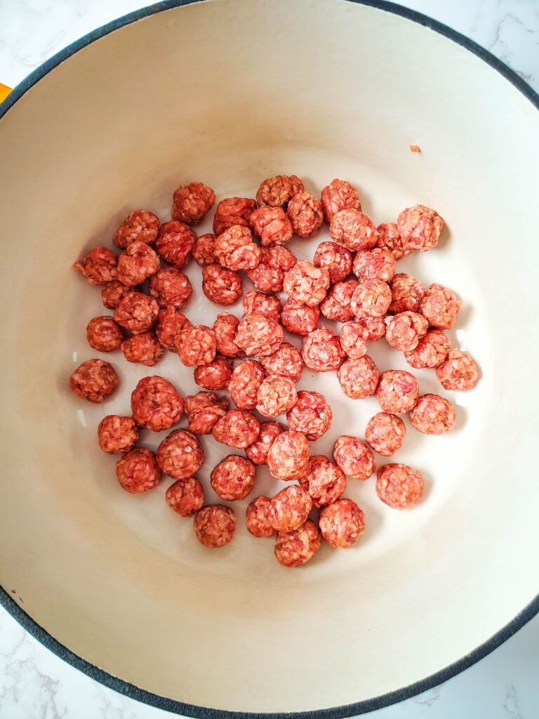 Form the sausage into small balls (¼–½ inch) and brown them in a large Dutch oven over medium heat until cooked through. - Sauté the onions: