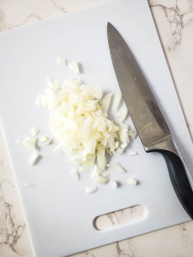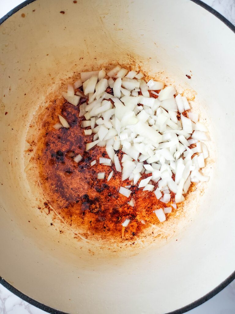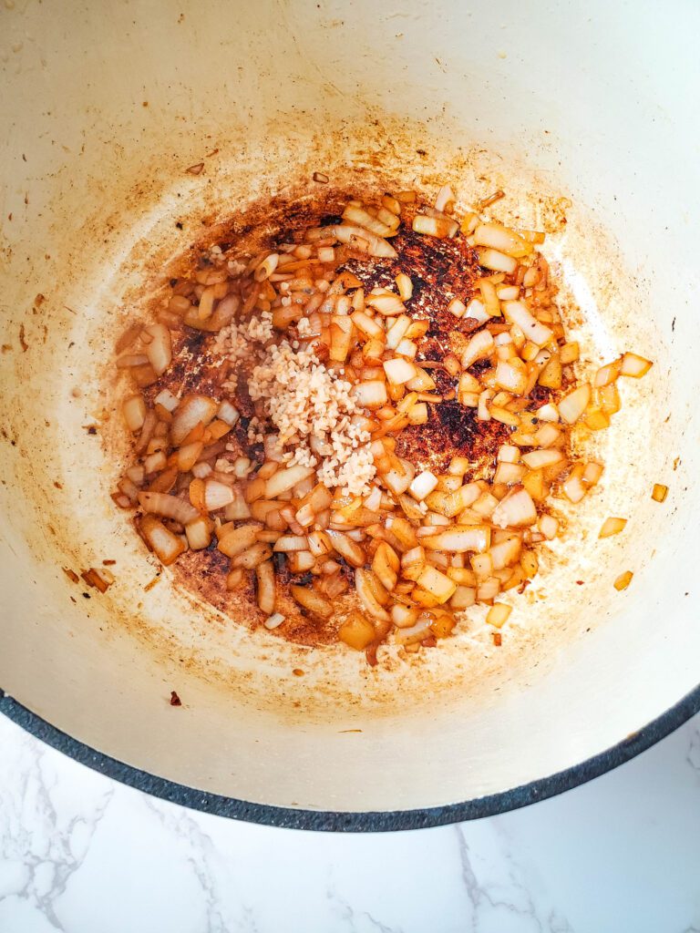 Remove sausage and set aside. Add diced onion to the same pot and cook for 5 minutes until softened. - Add garlic: