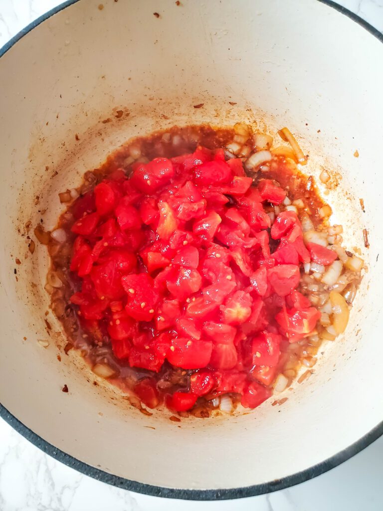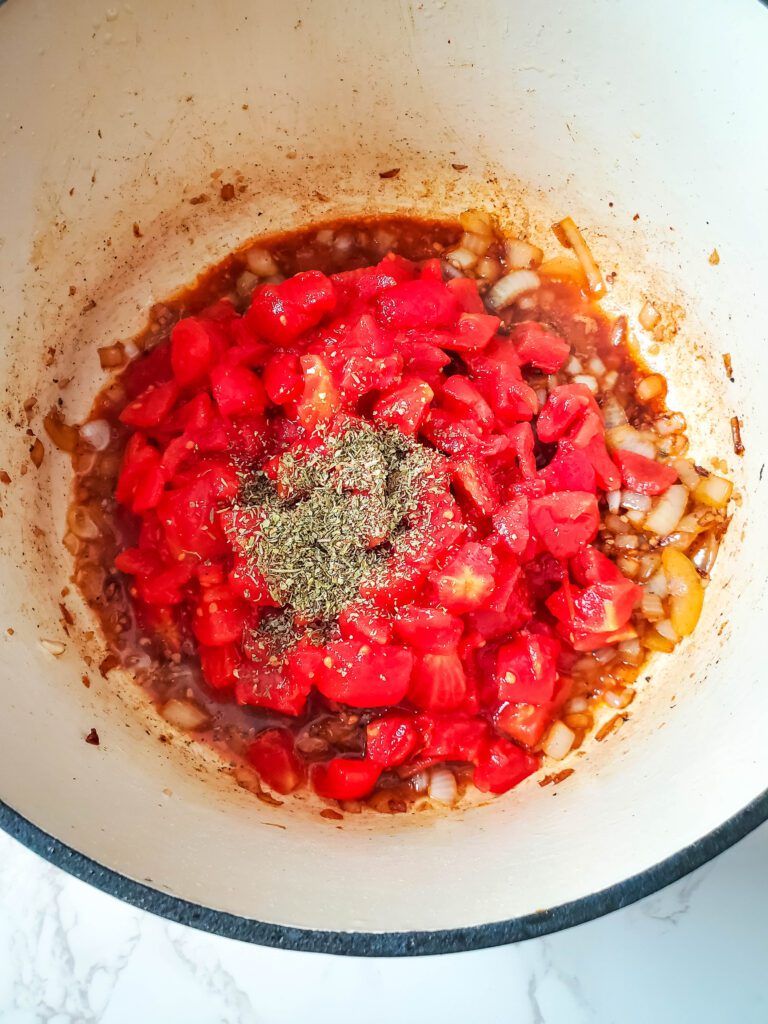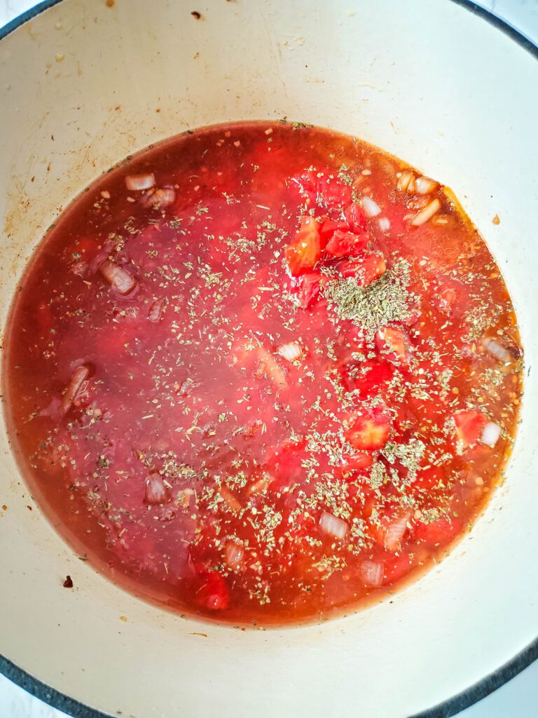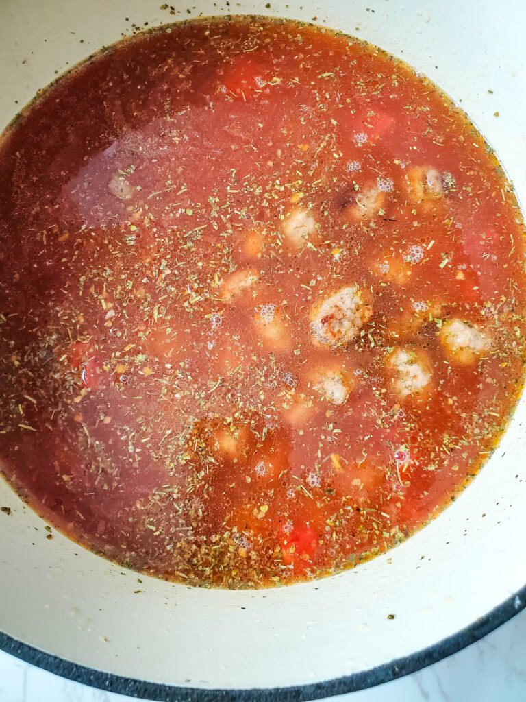 - Add sausage, tomatoes, Italian seasoning, and broth. Bring to a boil.