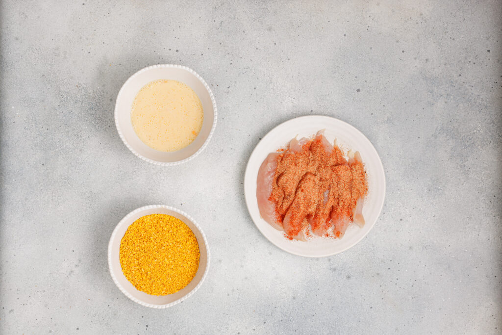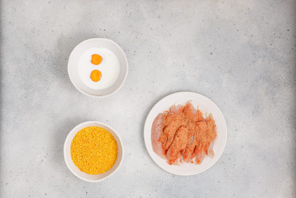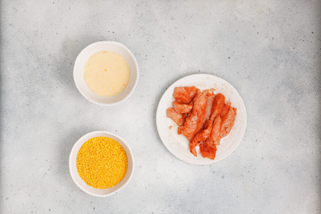 4. Season the chicken: In another bowl, mix garlic powder, smoked paprika, salt, and black pepper. Rub this seasoning into the chicken strips.