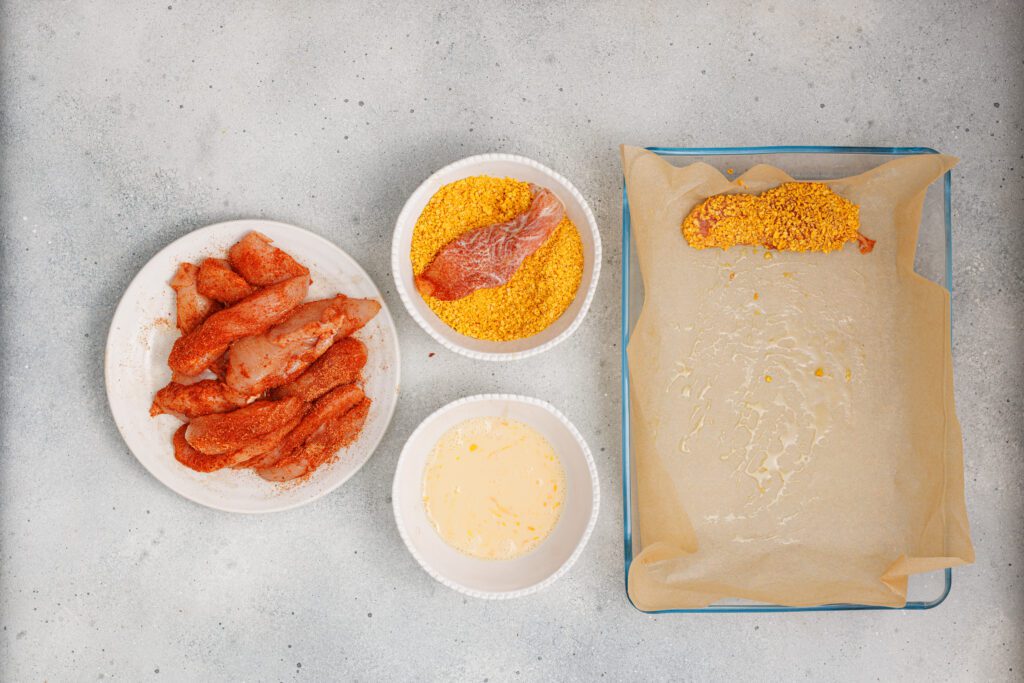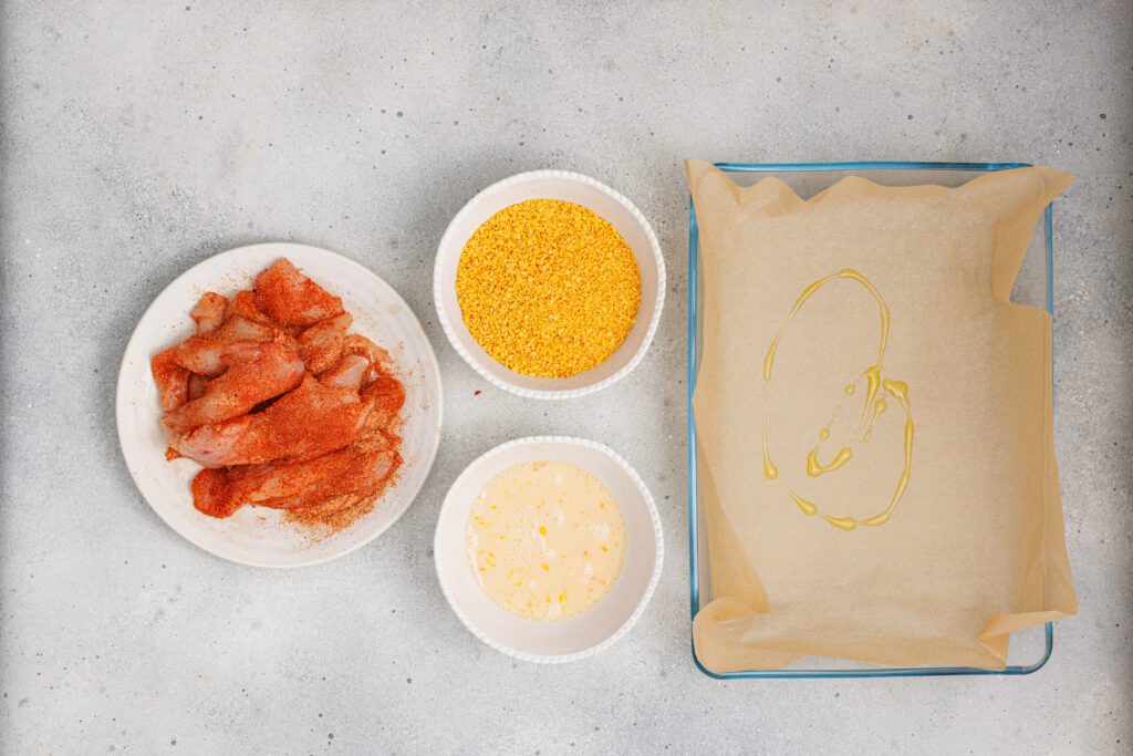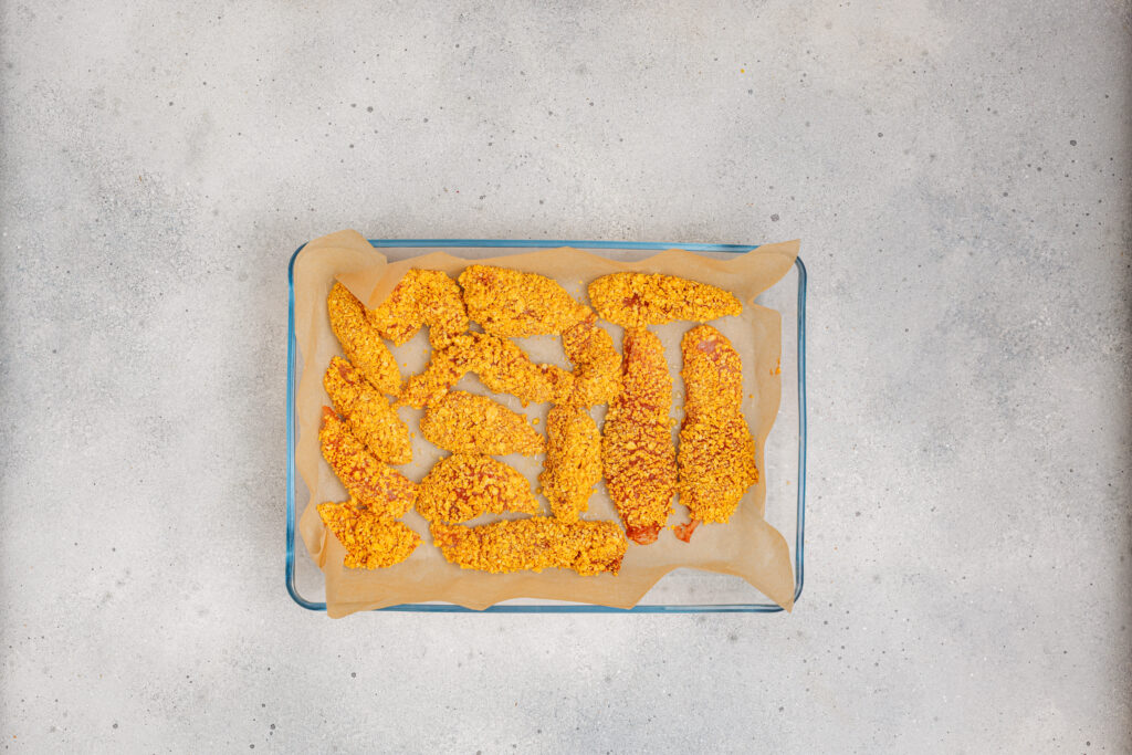 6. Bake: Preheat the oven to 400°F (200°C) and line a baking tray with parchment paper. Lightly grease it with cooking spray. Arrange the coated chicken strips on the tray and bake for 18–22 minutes, flipping halfway through, until golden brown and crispy.