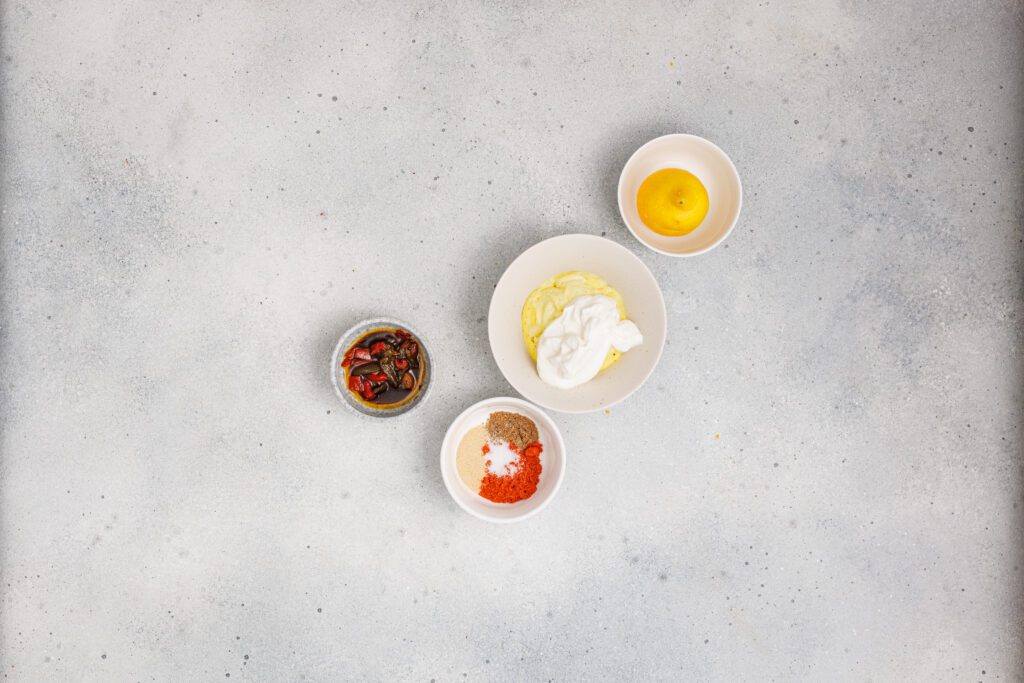 9. Blend the base: In a bowl, whisk together mayonnaise, sour cream, and lemon juice until smooth.