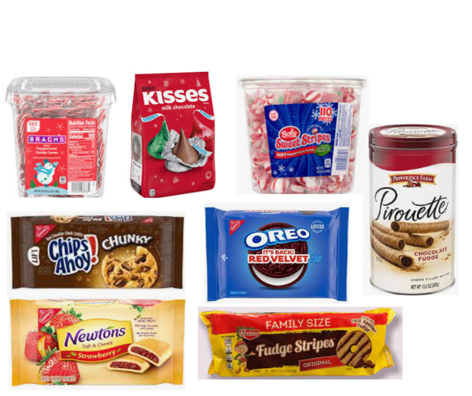 Fill in with pirouette cookies, strawberry newtons, and Hershey kisses. Top with candy canes and soft peppermints.
