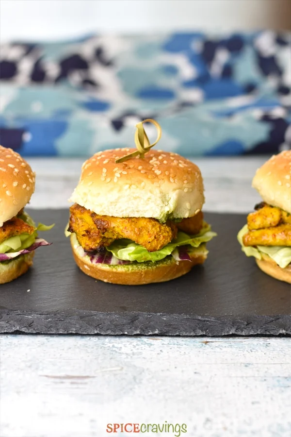 Tandoori Chicken Sliders are mini-burgers made with marinated & grilled chicken, buttery-soft slider buns and dressed with a tart & spicy cilantro-chutney spread.