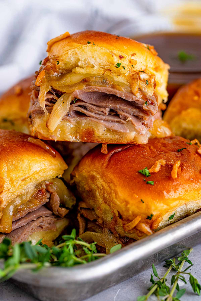 These French dip sliders are Hawaiian rolls stuffed with roast beef, caramelized onions, and cheese. Super easy to make and perfect for a large crowd!