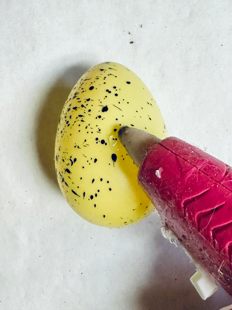 Once the wreath is pretty much covered, start adding your eggs with hot glue, I just randomly added them around the wreath. I tried not to get the same color next to each other.