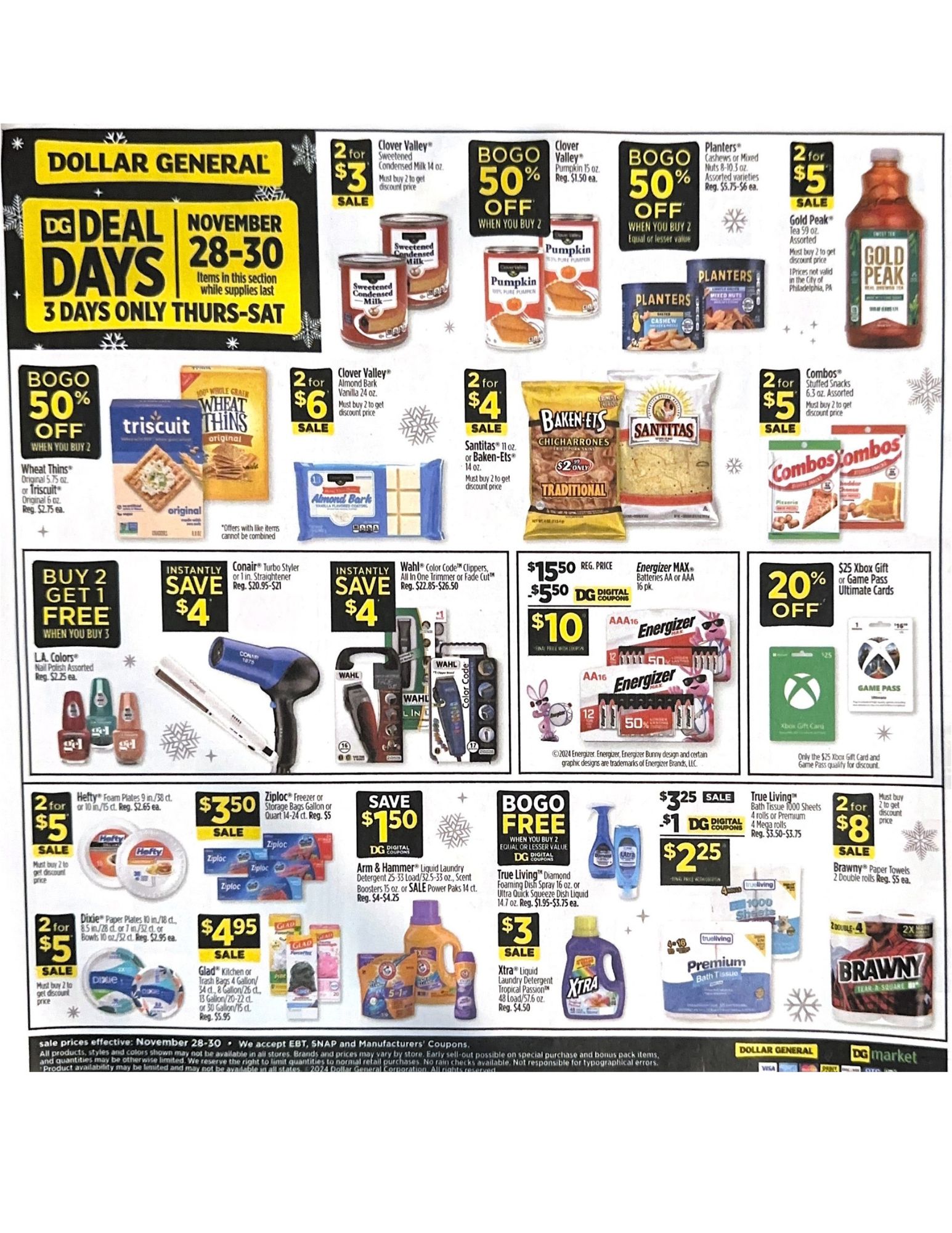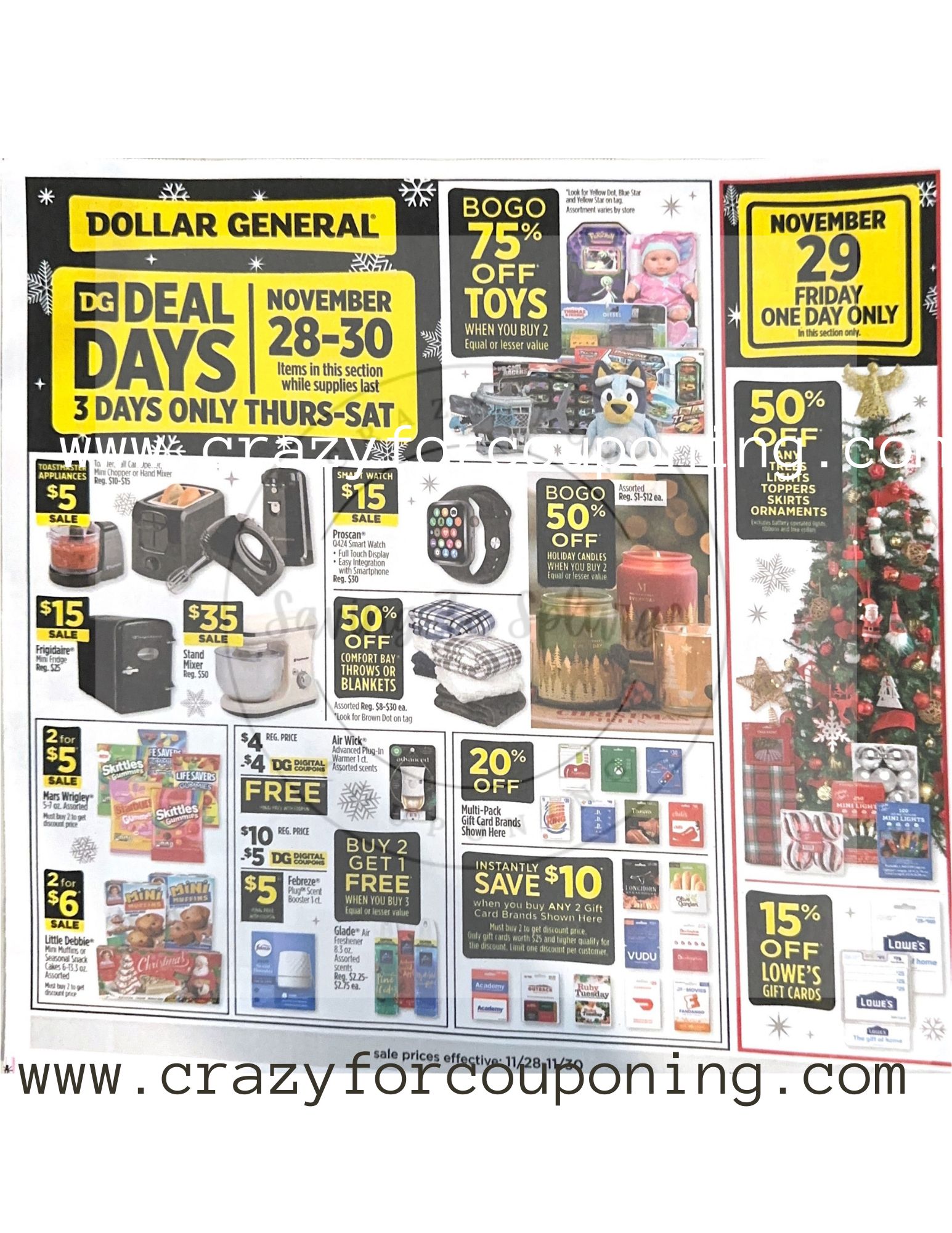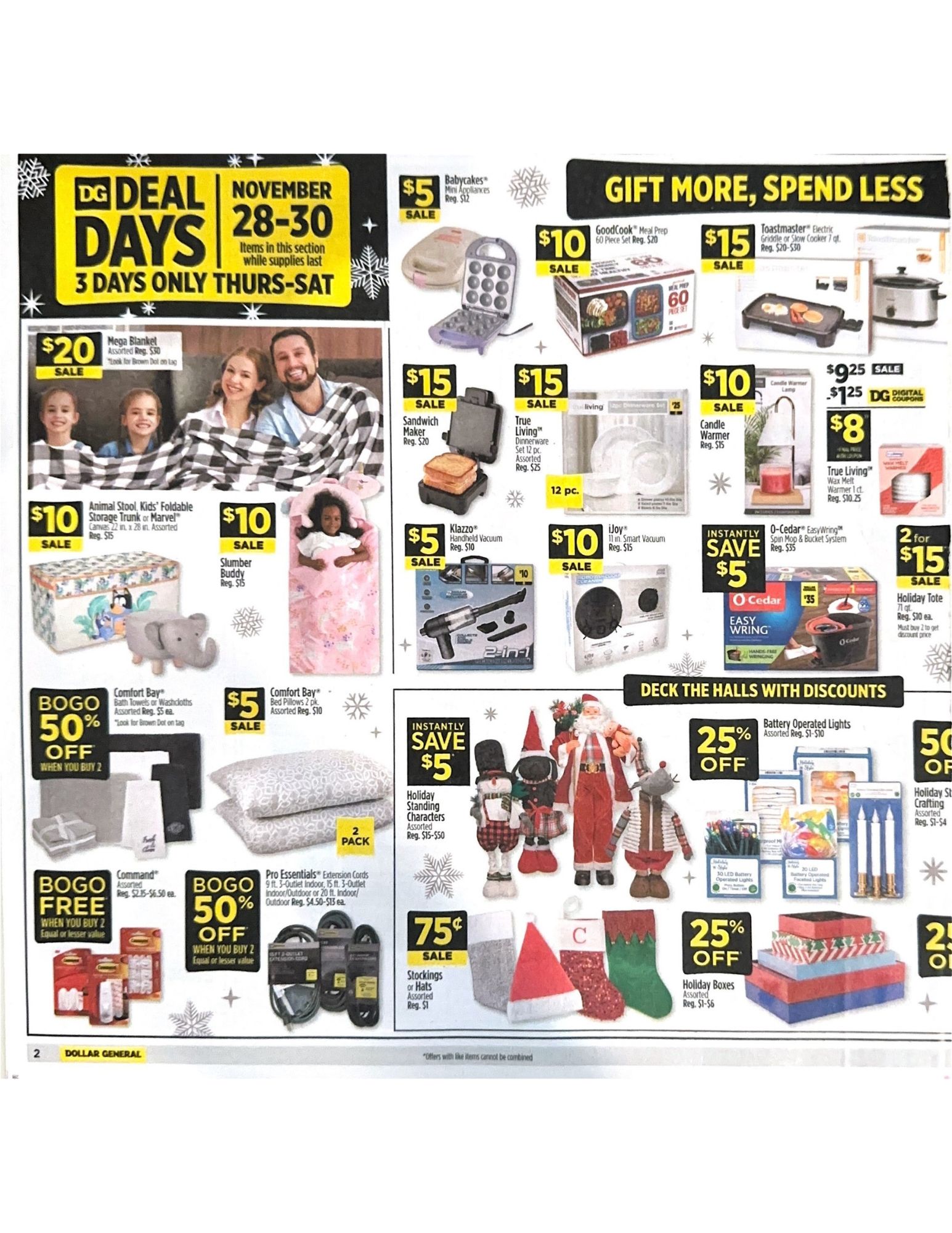 Dollar General’s Black Friday ad features discounts across various categories, including toys, holiday decor, electronics, and household essentials