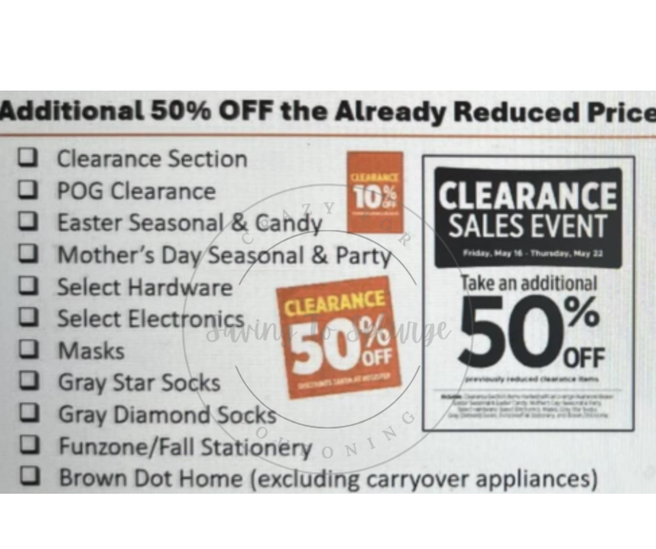 Seasonal Clearance; it is just what it sounds like, seasonal items. This includes sections such as garden, summer, etc. During these seasonal clearance events these items will be an extra 50% off.