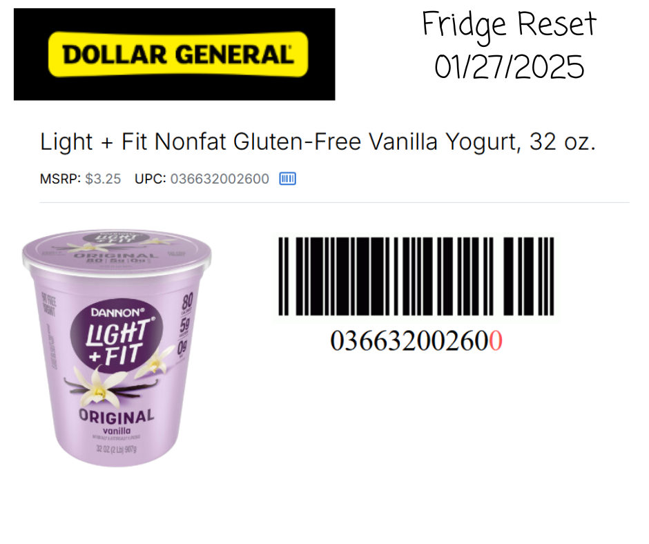 - Light & Fit Yogurt Vanilla 32oz – UPC: 0366-3200-2600