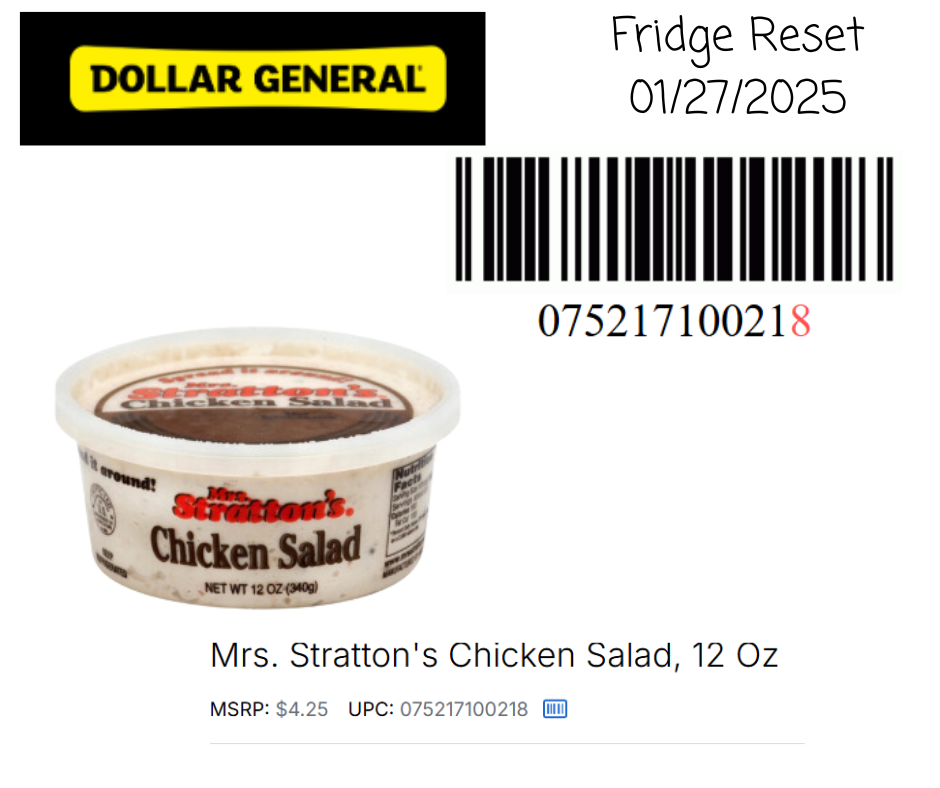 - Mrs. Stratton’s Chicken Salad 12oz – UPC: 0752-1710-0218