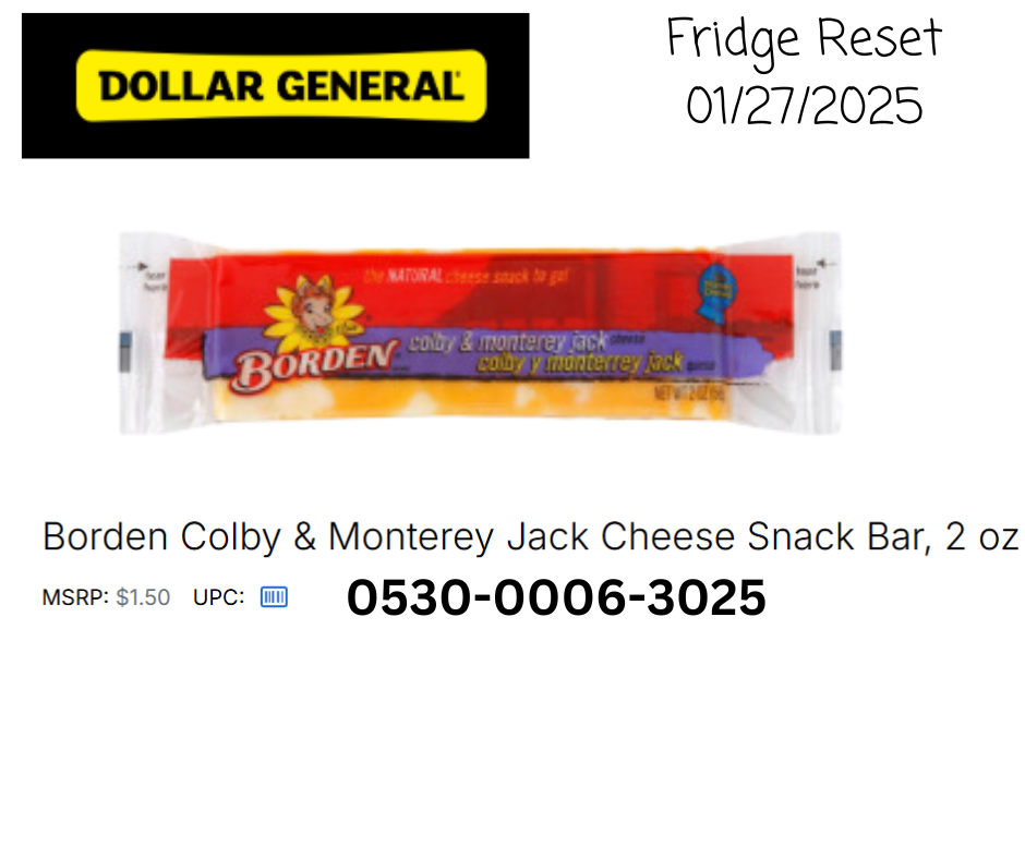 - Borden Stick Cheese Colby Jack Bar 2oz – UPC: 0530-0006-3025