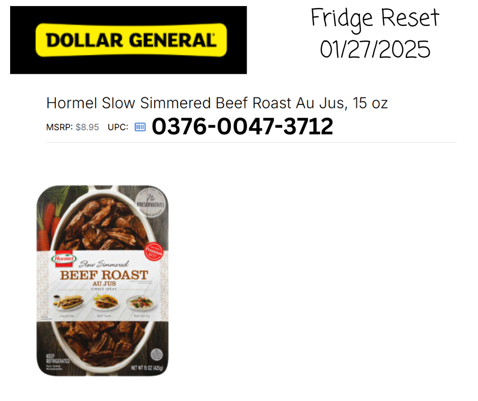 - Hormel Beef Roast Fully Cooked Entree 15oz – UPC: 0376-0047-3712